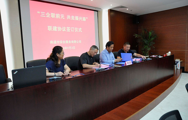 9月3日上午,“三企聯(lián)前元,共走振興路”聯(lián)建簽約儀式活動在保安公司四樓會議室成功舉行。城建集團(tuán)下屬南通市保安服務(wù)有限公司、南通市綠化造園開發(fā)有限公司、南通國信資產(chǎn)管理有限公司三家子企業(yè)與連云港東??h黃川鎮(zhèn)前元村簽訂聯(lián)建協(xié)議。連云港東??h黃川鎮(zhèn)副書記朱斌一行6人,國資委副調(diào)研員郁衛(wèi)東、黨群處處長曹權(quán)、城建集團(tuán)副總經(jīng)理朱紅軍以及保安公司等三家企業(yè)的負(fù)責(zé)人出席了簽約儀式?!?