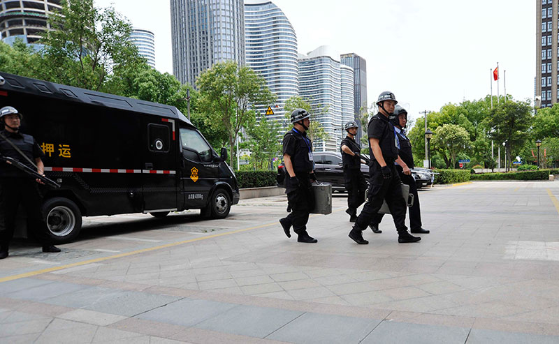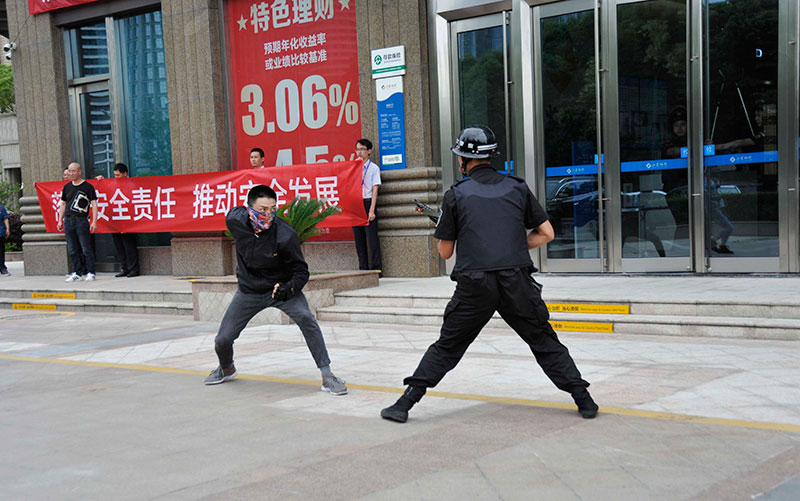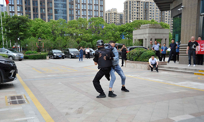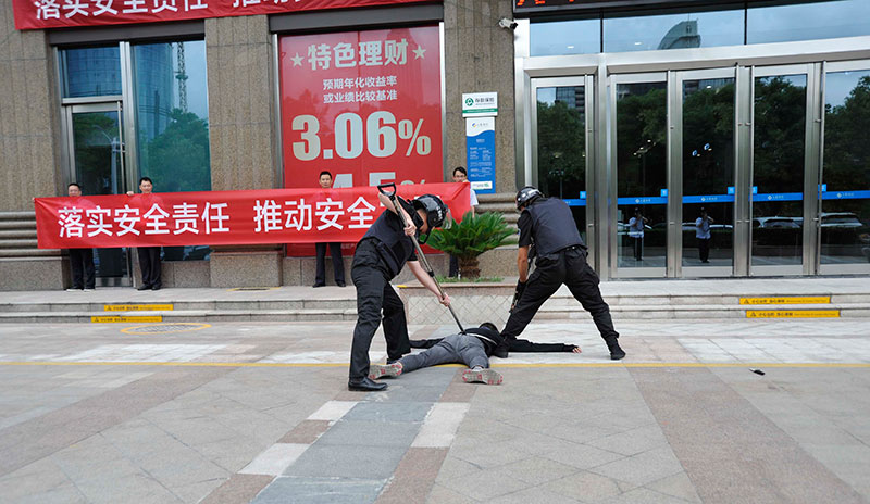 隨著演習(xí)總指揮方俊總經(jīng)理一聲令下,在江蘇銀行南通分行營(yíng)業(yè)廳外,經(jīng)過(guò)偽裝的2名“歹徒”手持兇器實(shí)施暴力搶劫,此時(shí)危機(jī)四伏,情況緊急,只見(jiàn)武裝押運(yùn)人員沉著冷靜、快速反應(yīng),在突發(fā)的緊急危險(xiǎn)情況面前,充分運(yùn)用伸縮警棍和鋼叉與歹徒展開(kāi)搏斗,最終將歹徒一一制服,確保了押運(yùn)任務(wù)的安全完成。演習(xí)過(guò)程中,押運(yùn)人員和營(yíng)業(yè)廳工作人員分工明確,處置情況沉著冷靜,動(dòng)作操作規(guī)范,保護(hù)了人員和款箱的安全。