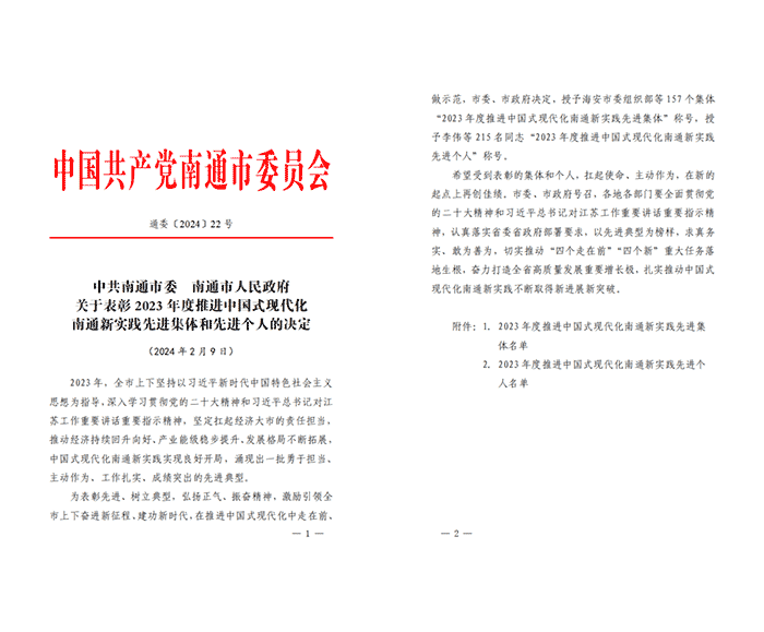 為表彰先進、樹立典型,弘揚正氣、振奮精神,市委、市政府向全市157個集體和215名同志授予光榮稱號。其中,南通保安公司榮獲“2023年度推進中國式現(xiàn)代化南通新實踐先進集體”稱號!